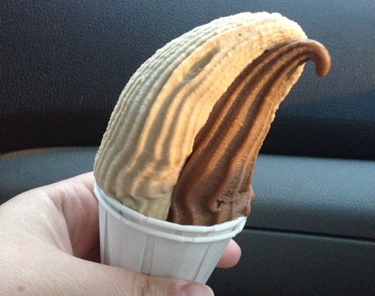These photos have chocolate and vanilla soft serve mixed with peanut butter Italian Ice. Another great combo is mango, red raspberry, and vanilla soft serve!