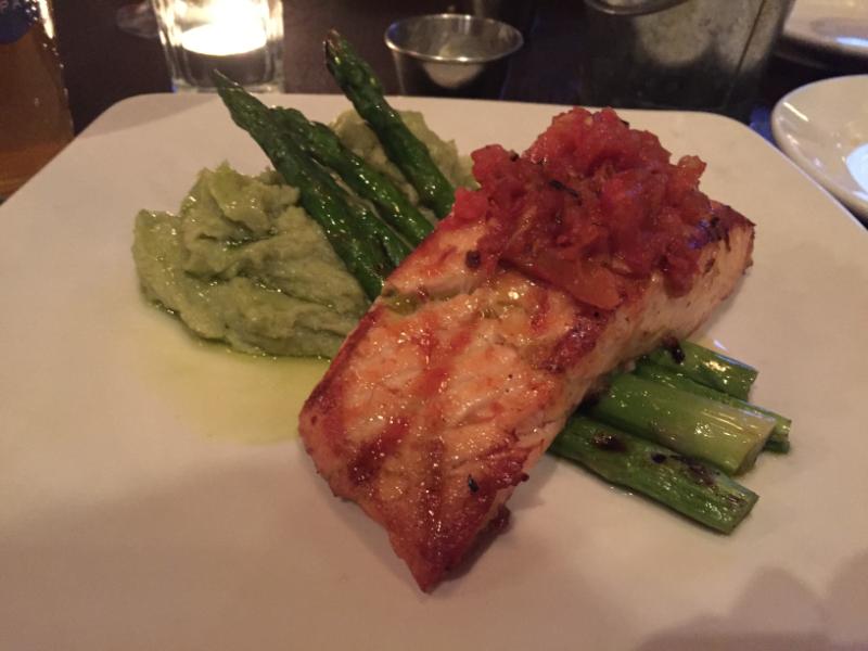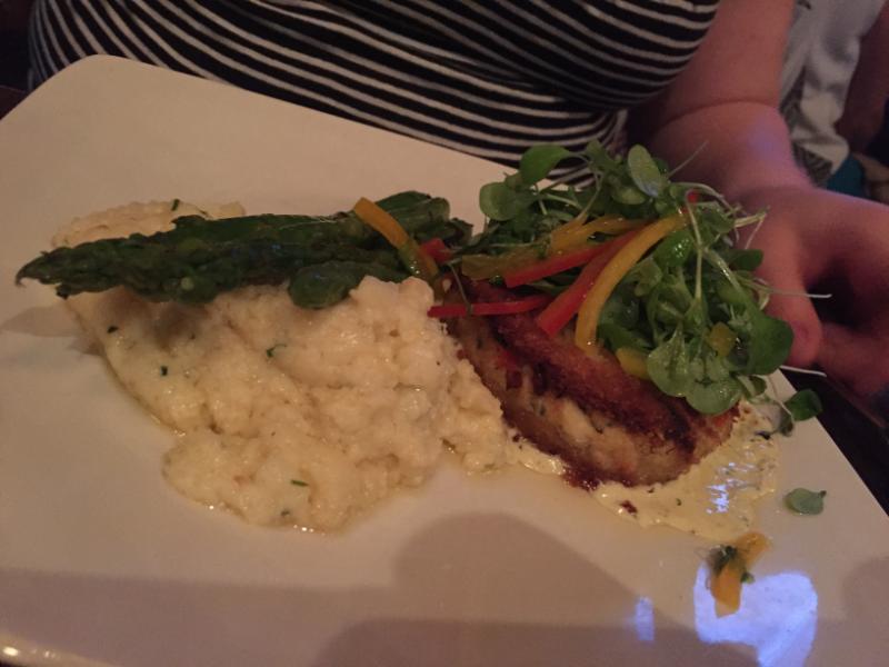 These four photos show two of their “Big Fish” entrees and the moist corn bread with honey butter served as an accompaniment. The salmon with basil mashed potatoes, asparagus, charred tomato compote, and curry oil was fantastic! I normally like my salmon rare to avoid the cooking mishaps in the kitchen. I don’t like when it is chewy and/or too fishy. This salmon was cooked to perfection. It was juicy and had a crispy outside. I loved it! The jumbo lump crab cake with cheddar, chive, and scallion grits, grilled asparagus, and remoulade was spectacular! The fish was fresh and all of the flavors on the plate just complemented one another so well.