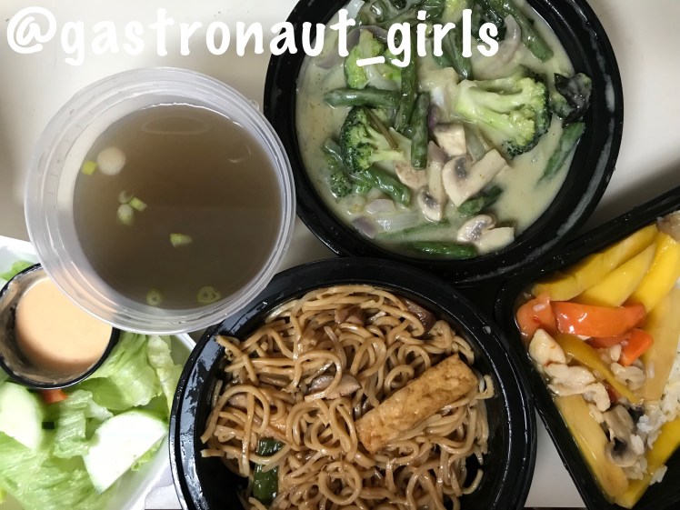 Above: Vegetable Green Curry, Pad Mee Leung with Tofu and Chicken with Mango Sauce. Sides of Ginger Salad and Pho-like soup.