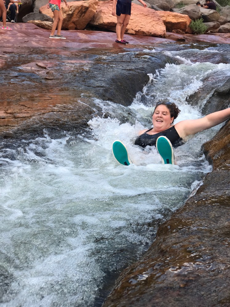 Slide Rock State Park should be renamed “Slippery Rock State Park” because it might have been the most dangerous thing we’ve ever done; and we were extremely ill prepared for this concrete amusement park (for lack of better terms). We didn’t have water shoes, towels, chairs or a safe place for our belongings. However, what is life but one big adventure, right? We made it work. Nat wore her Sperry’s and I walked barefoot – very carefully, along the moss covered rocks. We took turns playing on the natural “slides” while the current dragged us into the deeper water, and hoisting ourselves back up.