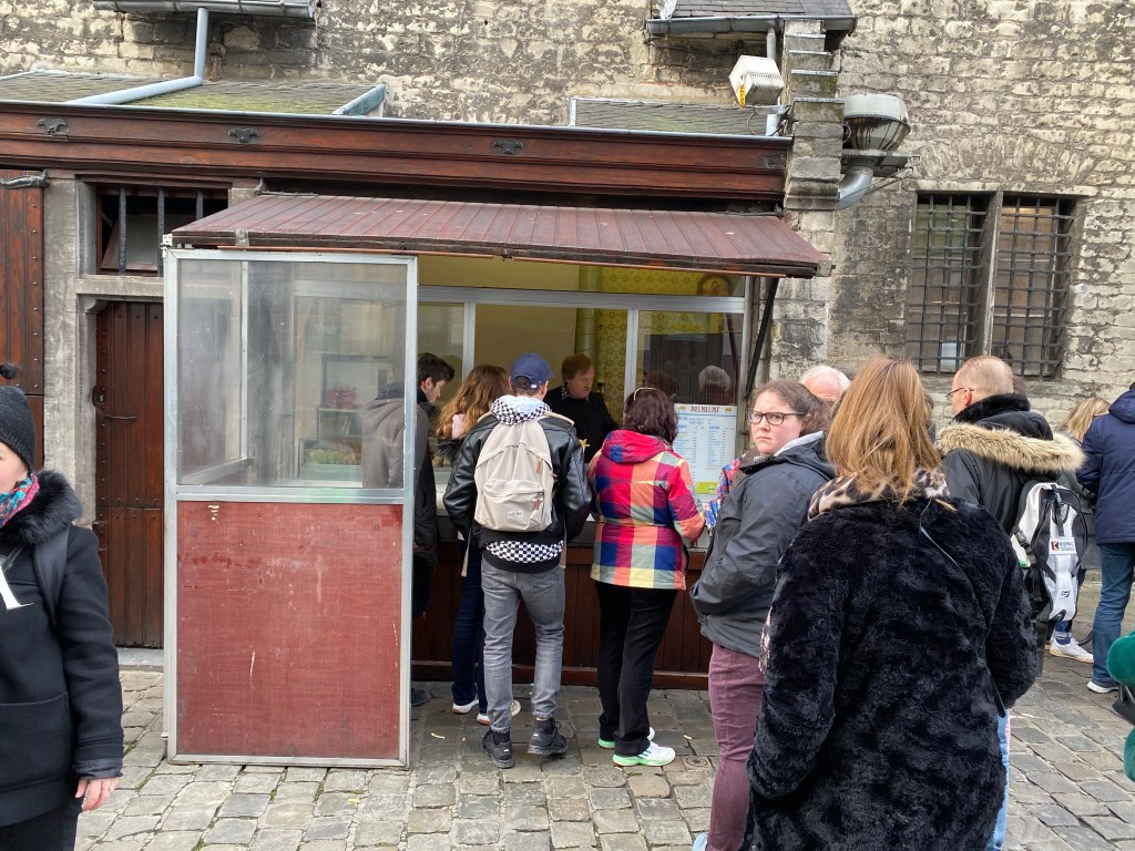 Next on the list was the famous unmarked frites stand behind the butcher shop. We got two orders of fries specifically so we could try the unique sauces- the region’s mayo and curry.