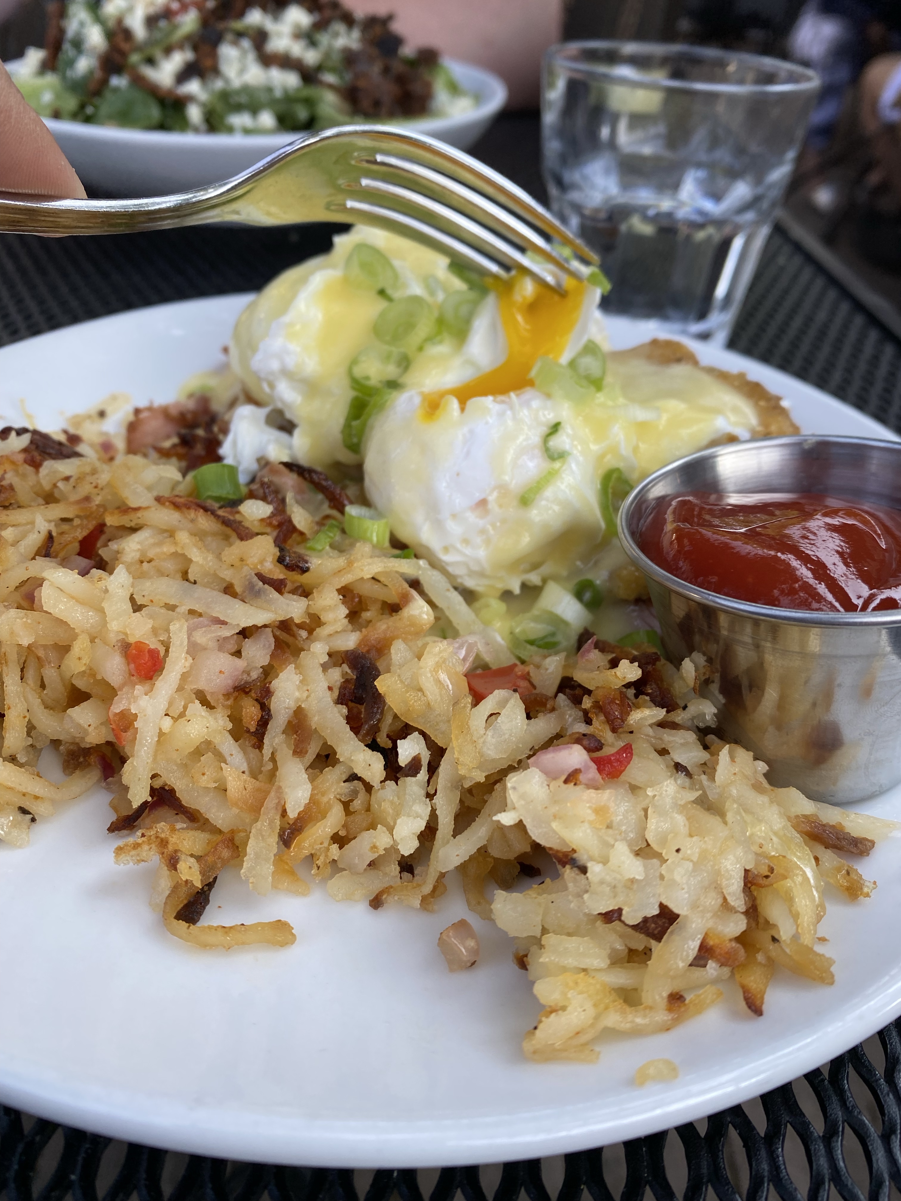 The next day, we ate brunch downtown, at Cafe Genevieve. We ordered a fried green tomato Benedict and a salad with “pig candy” aka really crispy candied bacon. Then, we explored Mormon Row and what was left of the 19th century community that was once inhabited by Mormon settlers. After some additional turn offs to sightseeing locations, we sadly left Grand Teton and headed towards Yellowstone.
