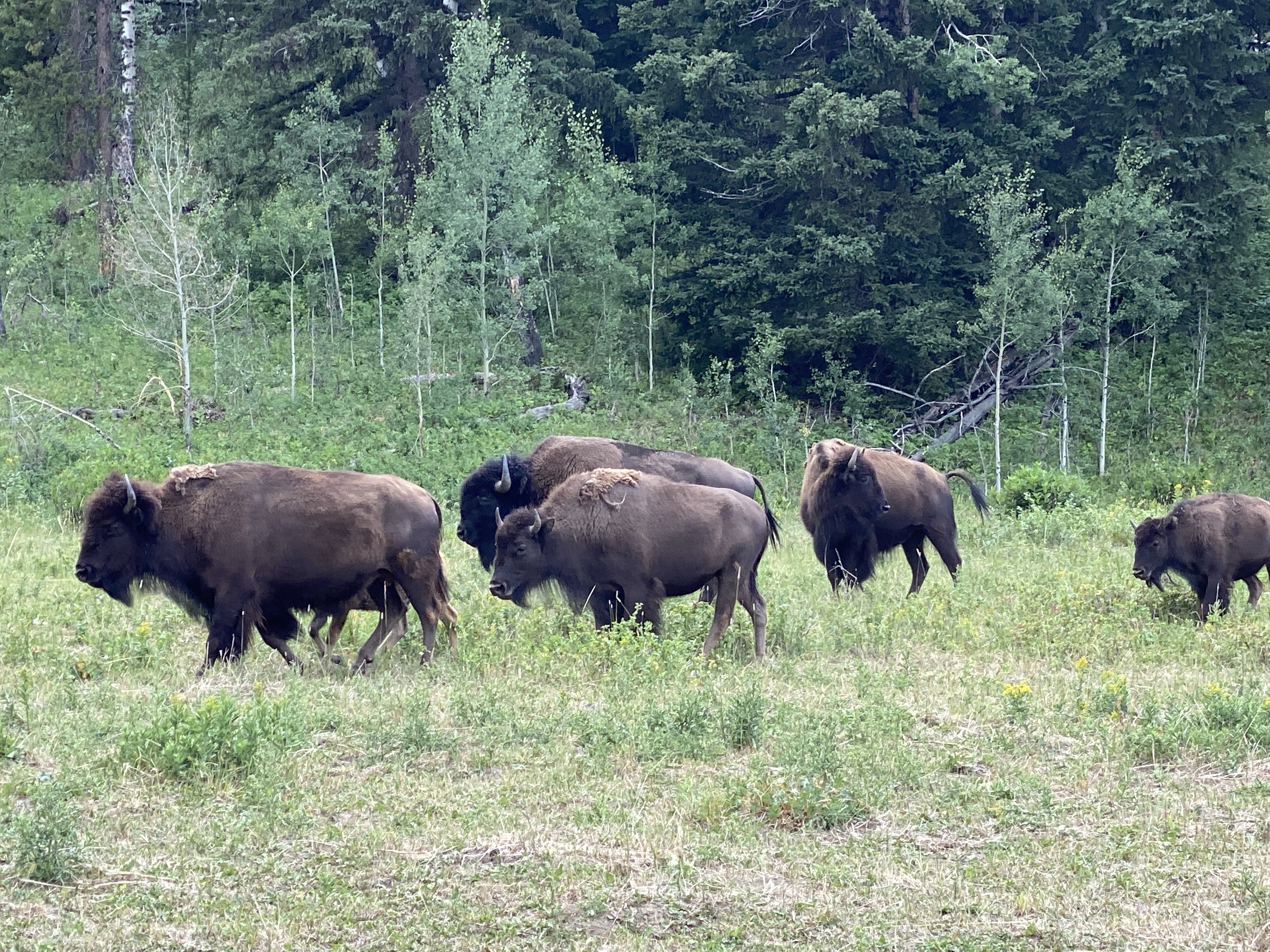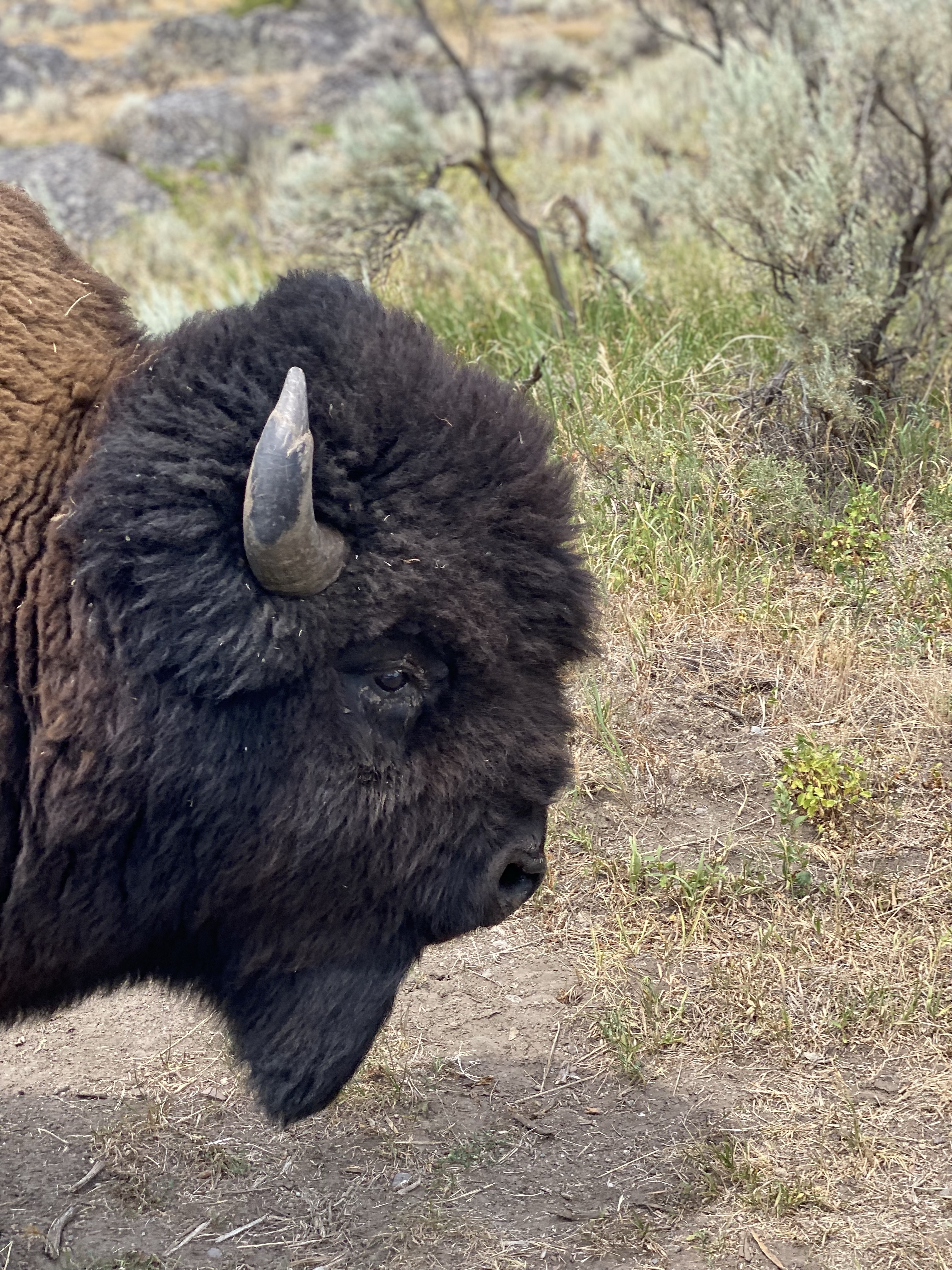 Yellowstone is statistically more visited every year than Glacier and Grand Teton, but it was our least favorite. This park was sold to us as “more of a scenic drive” park, which if you’ve been paying attention, that’s not what enchants us. What we did get out of Yellowstone was some wildlife action. We saw our second grizzly bear (and by saw I mean, hardly, through binoculars). You don’t actually have to peep the animals yourself, all you have to do is look for groups of cars pulled over on the side of the road. We were forced to stop a few times for many packs of bison. They are cute and ugly at the same time and spend their days roaming, rolling in the grass and being admired by annoying passer-biers with cameras.